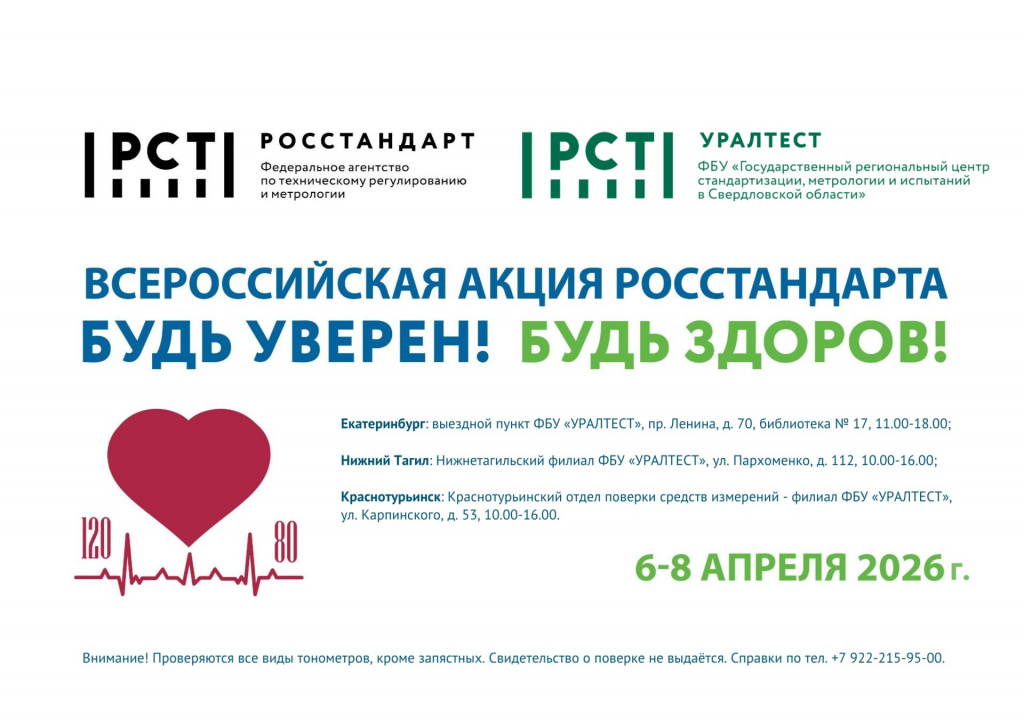 Всероссийская акция Росстандарта по проверке работоспособности бытовых тонометров «Будь уверен! Будь здоров!» состоится 06-08 апреля 2026 года. Мероприятие, приуроченное к Всемирному дню здоровья, пройдёт во всех регионах страны уже в седьмой раз. Ключевой целью мероприятия является привлечение внимания граждан нашей страны к значимости единства измерений в жизни каждого, т.к. артериальное давление является одним из важнейших показателей состояния здоровья человека, а от точности показаний тонометра, в свою очередь, зависит реальная картина состояния сердечно-сосудистой системы.